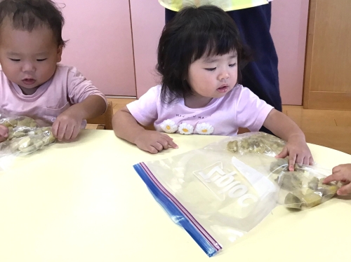 「これ、なあに?」「つめたいね」とでも話しているようにお友だちと顔を見合わせながら、手のひらいっぱいに秋のぬくもりを感じます。