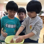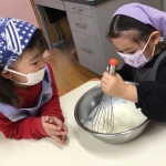 「トロトロだ~」「牛乳を入れたら少し硬くなったね」と、生地の変化に気づき、友だち同士で伝え合う様子からは、観察する力や言葉で表現する力が育っていることを感じました。