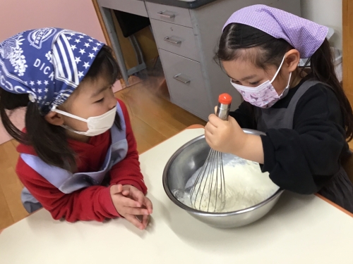 「トロトロだ~」「牛乳を入れたら少し硬くなったね」と、生地の変化に気づき、友だち同士で伝え合う様子からは、観察する力や言葉で表現する力が育っていることを感じました。