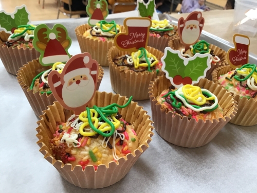焼きあがった後はいよいよトッピング。チョコペンやカラースプレーを使い、それぞれが思い思いに飾りつけをして、世界に一つだけのカップケーキが完成しました。