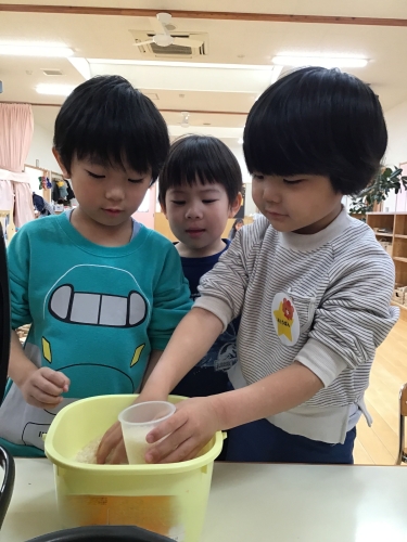 4歳児のお当番活動は、給食準備の椅子運びやテーブル拭き、そして5歳児さんに教えてもらいながらの米研ぎなど、無理のない簡単な内容からスタートしています。